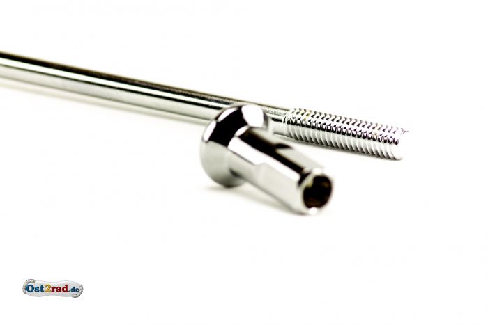 Speiche mit Nippel mit Gewinde M4 und Funktionslänge 163mm (die gesamte Länge ist ca. 3-4mm länger). Es handelt sich um 1. Qualität der Firma WWS Speichen (Kleeblatt), deutsche Produktion. Die Speiche ist aus Spezialdraht gefertigt, Edelstahl rostfrei, das Nippel aus speziellem Messing, vernickelt. Geliefert wird hier im Set 1 Stück gerade Speiche und 1 passendes Nippel dazu. Passend für MZ , Typ ETZ für Vorderrad mit originaler (ungelochter) Bremsscheibe mit diese Speichenlänge, in der Regel Felge 18 Zoll mit 36 - Loch.