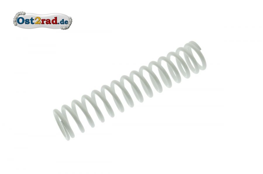 Neue, weiße Feder für hinteres Federbein für alle standardmäßigen Stoßdämpfer mit außenliegender Feder, passend für Typen SIMSON Enduro und S51 C, sowie MZ und MUZ (Saxon) ETZ 125, 150, 250, 251 und 301. Extra stark gepulvert mit Spezialpulverlack für Fahrzeugbau, salzwasserfest.