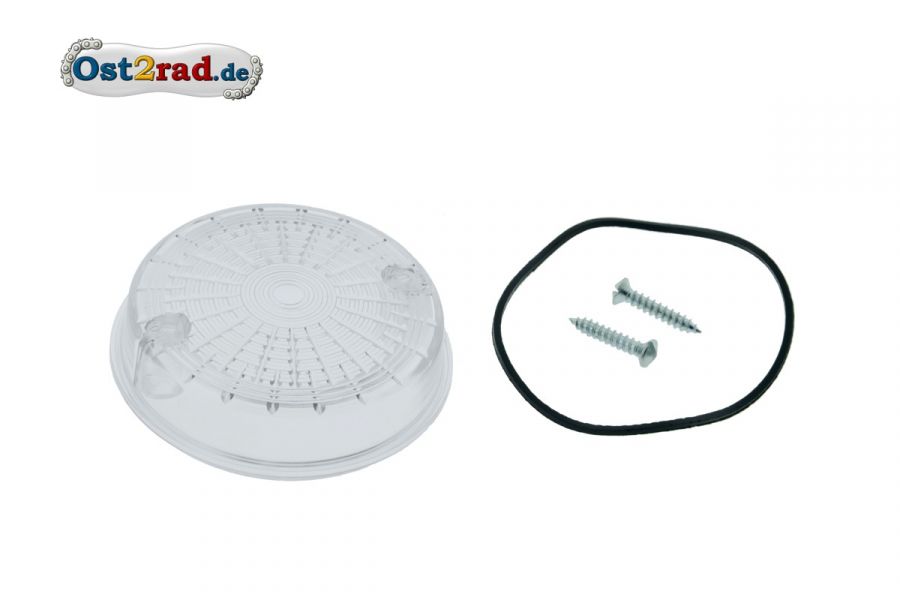 Neues, rundes Glas für Blinkleuchte hinten mit weißem Lichtaustritt passend für TS 125, TS 150, TS 250/0, TS 250/1, sowie alle ETZ 125, ETZ 150, ETZ 250, ETZ 251 und ETZ 301 mit runden Blinkern. Außerdem passend für SIMSON S50, S51, S70, SR50 und SR80. Die Lieferung erfolgt mit Dichtgummi und Schrauben.