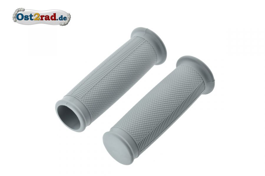 Jeu de caoutchoucs pour poignées de guidon, gris, droite et gauche, pour AWO-S, AWO-T, BK 350, scooter IWL, Berlin, Troll, Wiesel, Pitty, EMW et BMW Oldtimer. Les poignées en caoutchouc sont bombées, épaisses, ancien modèle original avec petite collerette et profil moleté. Longueur totale : env. 12 cm. La poignée d'accélérateur a un diamètre intérieur de 24-26mm et est ouverte à l'extérieur. La poignée fixe a un diamètre intérieur de 21-23mm et est fermée à l'extérieur. Si nécessaire, on peut facilement couper le côté fermé avec un couteau. Utilisable pratiquement sur la plupart des motos anciennes, spécialement recommandé pour les séries de types MZ et IFA.
