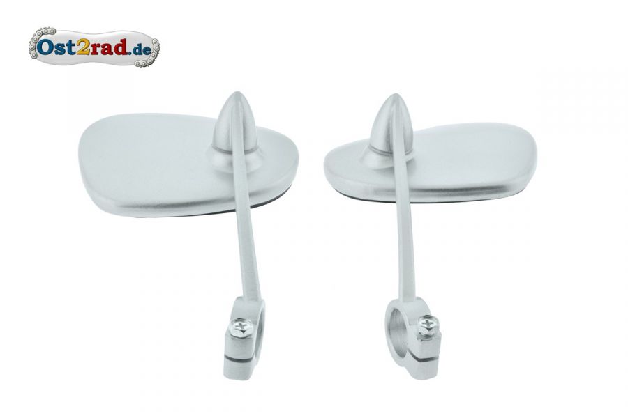 Paire de rétroviseurs en forme de rein, à droite et à gauche, convenant à tous les scooters IWL Pitty, Wiesel, Troll et Berliner, aux types MZ ES, ETS, TS et aux séries d'oiseaux Simson comme Star, Habicht, Sperber et KR51 Schwalbe. Les rétroviseurs sont entièrement fabriqués en métal (pas de plastique) avec un collier de fixation sur le guidon. Exécution de haute qualité correspondant aux rétroviseurs d'origine. Ils sont peints couleur argent, le verre est fabriqué avec un effet de réduction. Convient à tous les guidons de 22 mm de diamètre, également pour d'autres motos anciennes.