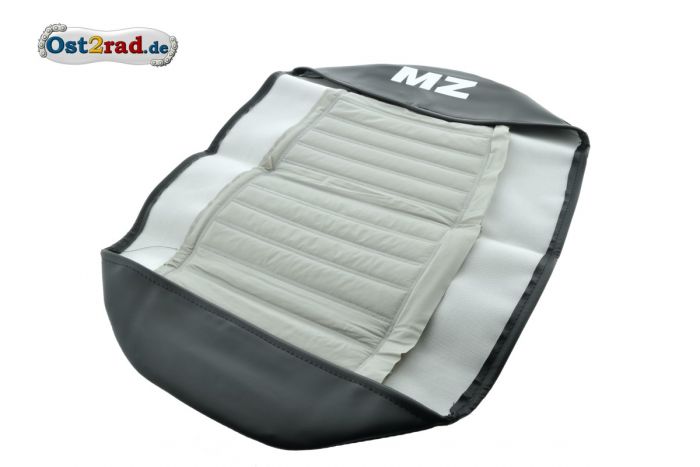 Housse de selle en similicuir noir, des types TS 125 et TS 150. La housse est gaufrée avec des motifs. Non surpiquée et donc imperméable. Sans découpe pour le compartiment à outils, mais avec le logo MZ.